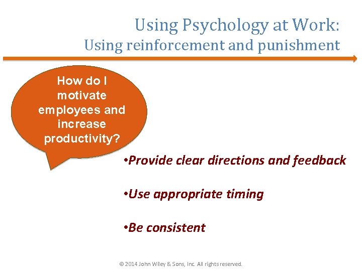Using Psychology at Work: Using reinforcement and punishment How do I motivate employees and increase productivity? • Provide clear directions and feedback • Use appropriate timing • Be consistent © 2014 John Wiley & Sons, Inc. All rights reserved.