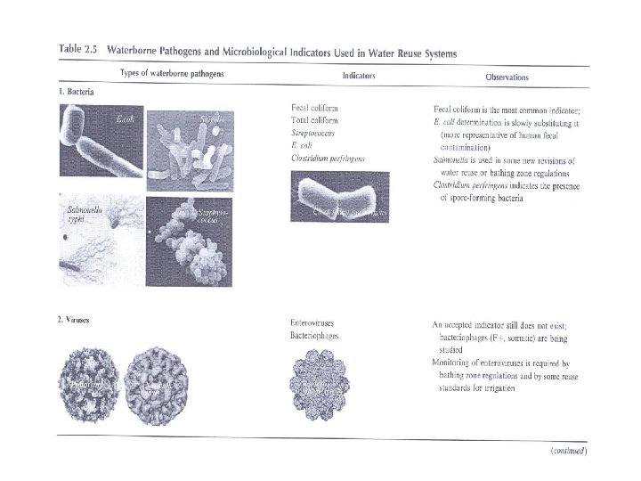 PARAMETERS WITH HEALTH SIGNIFICANCE 2. Pathogens Table 2. 3 enumerates the microbiological organisms (pathogens and indicator organisms) that are usually analyzed for to establish the presence or absence of health hazards. Table 2. 4 provides the survival time of some common pathogens under different conditions in fresh water, sludge, soil, and crops.