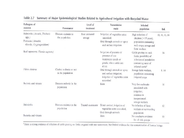 PARAMETERS WITH HEALTH SIGNIFICANCE 2. Pathogens Epidemiological studies conducted to date have not established definitive adverse health impacts attributable to the use of appropriately treated recycled water for irrigation. Nevertheless, there is clear epidemiological evidence of health problems when raw or improperly treated wastewater is used for irrigation in areas where such infections are endemic. Table 2. 5 summarizes the findings of some of these studies.