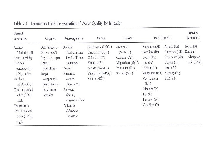 PARAMETERS WITH AGRONOMIC SIGNIFICANCE 1. Salinity Recently, the classification of saline water has been reconsidered (Table 2. 6) on the basis of research and practical observations. This classification must be used only as a guideline to determine the level of salinity of irrigation waters. It is important to stress that Table 2. 6 cannot be used to assess the suitability of saline water for irrigation, because a number of other conditions must be taken into account, including crop, climate, soil, irrigation method, and management practices