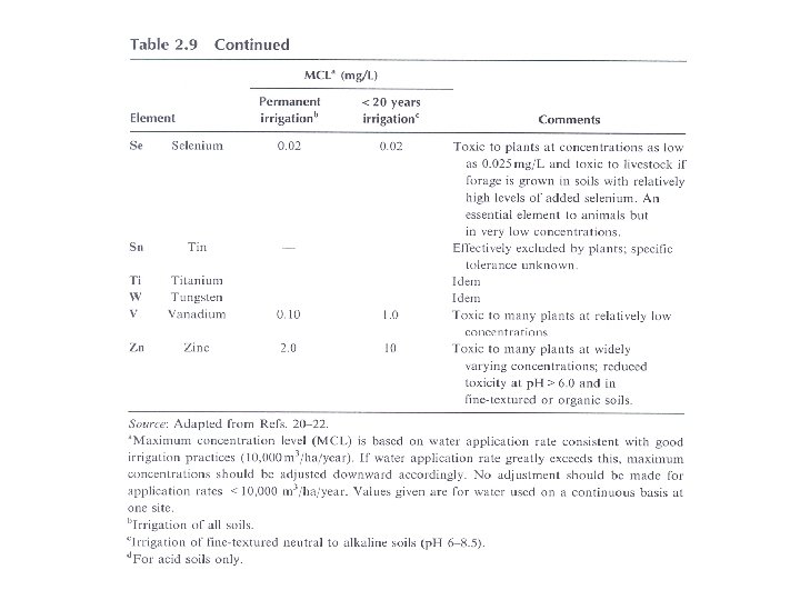 PARAMETERS WITH AGRONOMIC SIGNIFICANCE 4. Trace Elements Trace elements are not normally included in the routine analysis of regular irrigation water, but attention should be paid to them when using treated municipal effluents, particularly if contamination with industrial wastewater discharge is suspected. (see following table)