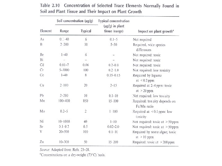 PARAMETERS WITH AGRONOMIC SIGNIFICANCE 4. Trace Elements Some trace elements are essential at low concentrations (following table) but toxic at elevated concentrations (e. g. , Cu, Cr, Mo, Ni, Se, and Zn). As, Cr+6, Fl, Pb, Hg, Mo, and Se are considered to be of environmental concern because they are taken up by plants in amounts potentially harmful to animals and humans.