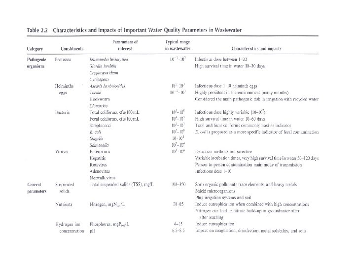 INTRODUCTION The typical concentrations in raw municipal wastewater and the main characteristics and impacts of these parameters for water reuse are given in Table 2. 2. Of the four categories, microbiological parameters have received the most attention. Since monitoring for all pathogens is not realistic, specific target organisms such as fecal or total coliforms are being used as indicators of potential health risk.
