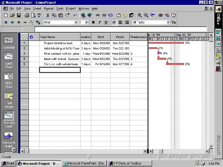 GANTT CHART: OPENING A NIGHTCLUB Production Activities Jun Jul Aug Sep Oct Nov 01. Locate site 02. Get liquor license 03. Hire contractors for renovation 04. Supervise renovation 05. Hire lighting contractor 06. Supervise lighting installation 07. Begin advertising of club 08. Hire club employees 09. Get booking agent for nightclub talent 10. Open for business Scheduled Completed 30 Nov Dec Jan