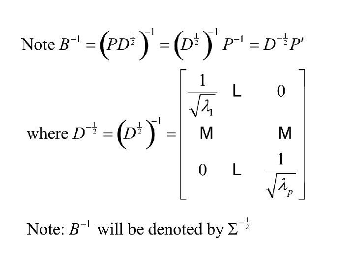 Applications of these results to Statistics Suppose that The random vector, [x 1, x 2, … xp] has a p-variate normal distribution with mean vector and covariance matrix S Then and covariance matrix S is positive definite. Suppose l 1, … , lp are the eigenvalues of S corresponding eigenvectors of unit length Note l 1 > 0, … , lp > 0