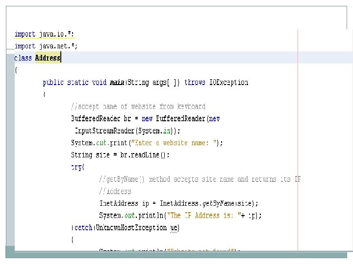 Networking Programming �import java. io. *; �import java. net. *; �class Address �{ � public static void main(String args[ ]) throws IOException � { � //accept name of website from keyboard � Buffered. Reader br = new Buffered. Reader(new � Input. Stream. Reader(System. in)); �