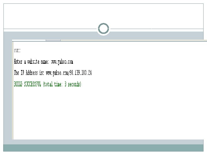 � System. out. print("Enter a website name: "); � String site = br. read. Line(); � try{ � //get. By. Name() method accepts site name and returns its IP � � � � �} //Address Inet. Address ip = Inet. Address. get. By. Name(site); System. out. println("The IP Address is: "+ ip); }catch(Unknown. Host. Exception ue) { System. out. println("Website not found"); } }
