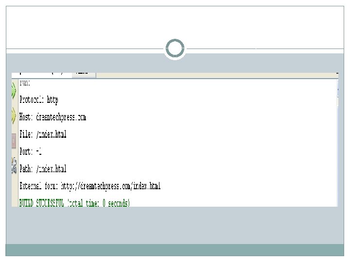 URL class � import java. net. *; � class My. URL �{ � public static void main(String args[ ]) throws Exception � { � URL obj = new URL("http: //dreamtechpress. com/index. html"); � System. out. println("Protocol: "+ obj. get. Protocol()); � System. out. println("Host: "+ obj. get. Host()); � System. out. println("File: "+ obj. get. File()); � System. out. println("Port: "+ obj. get. Port()); � System. out. println("Path: "+ obj. get. Path()); � System. out. println("External form: "+ obj. to. External. Form()); � } �}