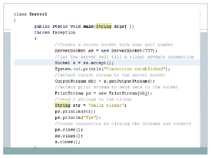 Server 1. java � import java. io. *; � import java. net. *; � class Server 1 �{ � public static void main(String args[ ]) � throws Exception � { � //Create a server socket with some port number � Server. Socket ss = new Server. Socket(777); � //let the server wait till a client accepts connection � Socket s = ss. accept(); � System. out. println("Connection established"); � //attach output stream to the server socket �
