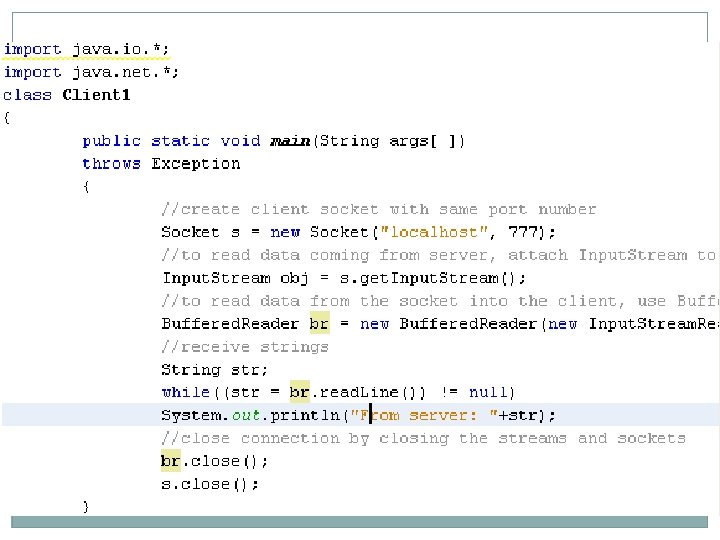 �Buffered. Reader br = new Buffered. Reader(new Input. Stream. Reader(obj)); � //receive strings � String str; � while((str = br. read. Line()) != null) � System. out. println("From server: "+str); � //close connection by closing the streams and sockets � br. close(); � s. close(); � } �}