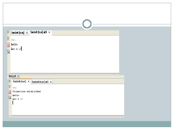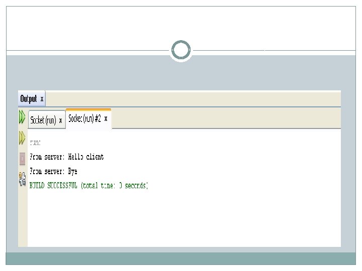 � Output. Stream obj = s. get. Output. Stream(); � //attach print stream to send data to the socket � Print. Stream ps = new Print. Stream(obj); � //send 2 strings to the client � String str = "Hello client"; � ps. println(str); � ps. println("Bye"); � //close connection by closing the streams and sockets � ps. close(); � } �}