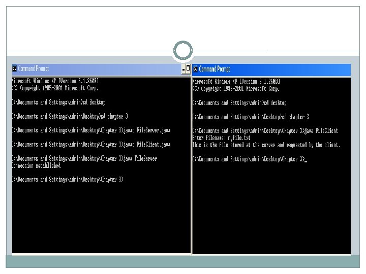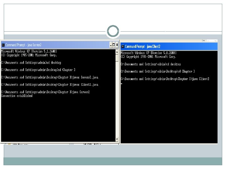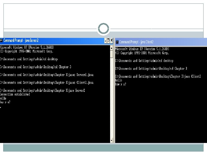 � Buffered. Reader kb = new Buffered. Reader(new � Input. Stream. Reader(System. in)); � while(true) //server executes continuously � { � String str, str 1; � //repeat as long as client does not send null string � � � � while((str = br. read. Line()) != null) //read from client { System. out. println(str); str 1 = kb. read. Line(); ps. println(str 1); //send to client } //close connection