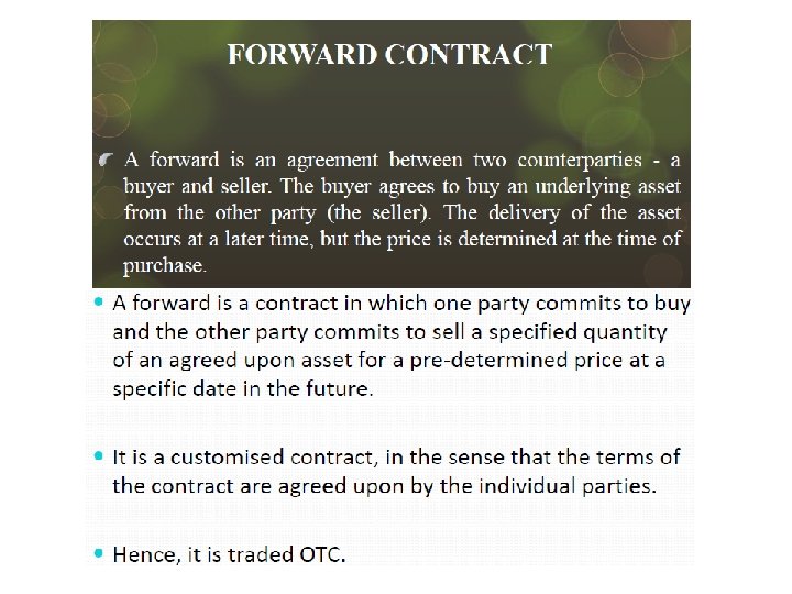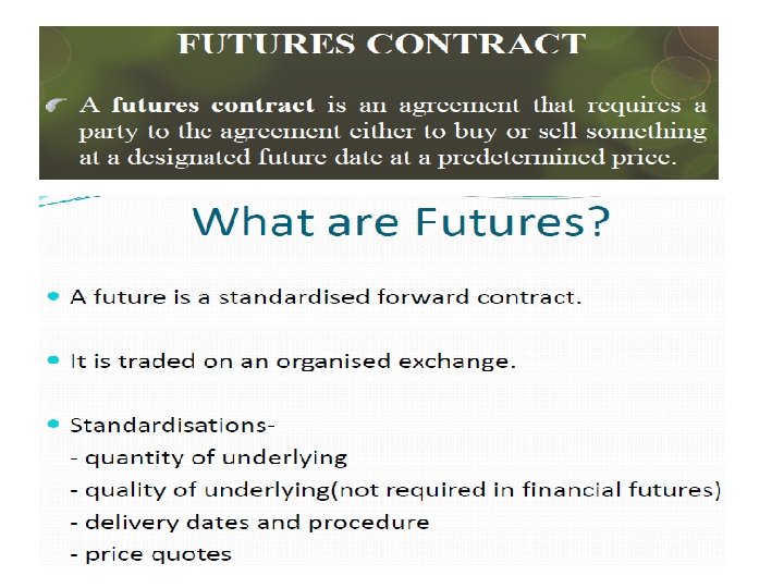 BASIS FOR COMPARISON FORWARD CONTRACT FUTURES CONTRACT Meaning Forward Contract is an agreement between parties to buy and sell the underlying asset at a specified date and agreed rate in future. A contract in which the parties agree to exchange the asset for cash at a fixed price and at a future specified date, is known as future contract. What is it? It is a tailor made contract. It is a standardized contract. Traded on Over the counter, i. e. there is no Organized stock exchange. secondary market. Settlement On maturity date. On a daily basis. Risk High Low Default As they are private agreement, the chances of default are relatively high. No such probability. Size of contract Depends on the contract terms. Fixed Collateral Not required Initial margin required. Maturity As per the terms of contract. Predetermined date Regulation Self regulated By stock exchange Liquidity Low High