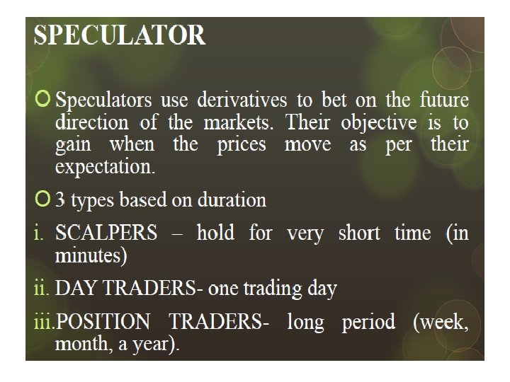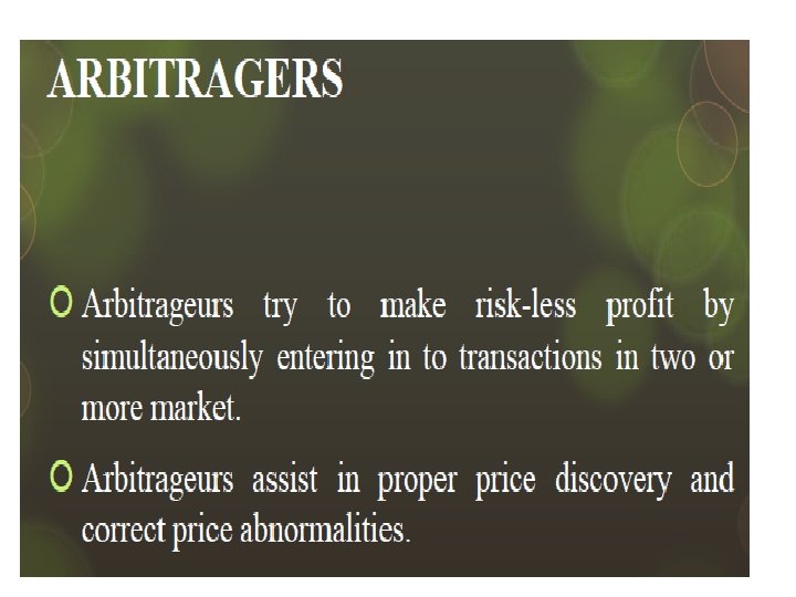 Players in the derivatives market? � Hedgers � Speculators � Arbitrageurs