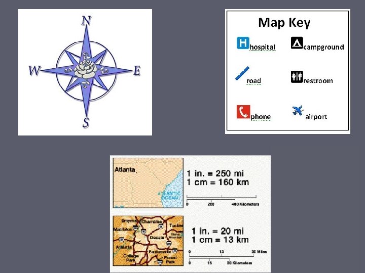 ►Map Tools: § Directional indicator – shows which directions are north, south, east, and west. § Compass rose – A directional indicator that has arrows that point to all four principal directions. § Scales – used to represent distances between points on a map § Legend or Key – explains what the symbols on the map represent