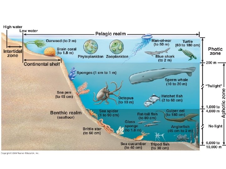 Ocean Zones • Intertidal – Area between high and low tides • Neritic – Intertidal zone to continental shelf • Photic – Area where light can penetrate down into • Benthic – Continental shelf to abyss • Abyssal – > 2000 meters deep and dark!!