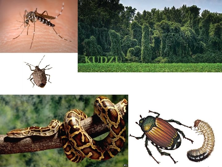 How do you like stink bugs, Japanese beetles, and pythons (in Florida)? Introduced, nonendemic or invasive species are species that are native to an area. • Flourish because they don’t have any natural predator. Could “out compete” native species • Alters the food chain in the environment – Python in the Everglades – Japanese beetle - here – Asian Tiger mosquito - here – Red eared slider turtle - here – Kudzu plant down South – Land Iguanas on the Galapagos Islands