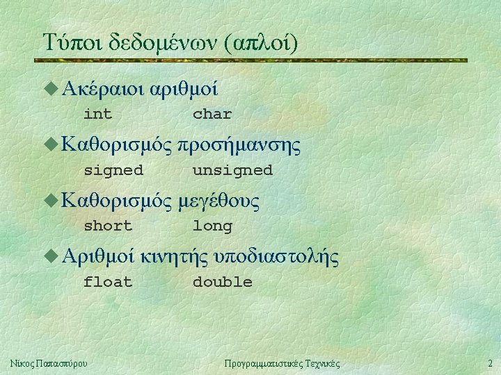 Πίνακας απλών τύπων δεδομένων char , signed char , unsigned char signed short int , unsigned short int signed int , unsigned int signed long int , unsigned long int float double long double uΜε κόκκινο χρώμα όσα μπορούν να παραλειφθούν. Νίκος Παπασπύρου Προγραμματιστικές Τεχνικές 3