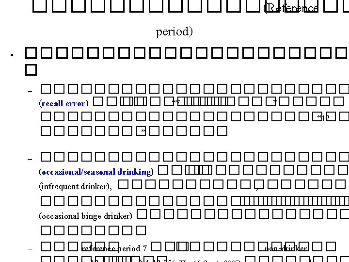Reference • • • Dawson DA. Methodological issues in measuring alcohol use. Alcohol Research & Health 2003; 27: 18 -29. Dawson DA, Room R. Towards agreement on ways to measure and report drinking patterns and alcohol-related problems in adult general population surveys: the Skarpo Conference overview. Journal of Substance Abuse 2000; 12: 1 -21. Feunekes et al. Alcohol intake assessment: The sober facts. American Journal of Epidemiology 1999; 150: 105 -112. Gmel et al. Measuring alcohol consumption-should the GF approach become the norm in survey research? Addiction 2006; 101: 16 -30. Heeb JL, Gmel G. Measuring alcohol consumption: A comparison of graduate frequency, quantity frequency, and weekly recall diary methods in a general population survey. Addictive Behaviors 2005; 30: 403 -413. NHES 2003 -2004 questionnaire and report from HSRI NIAAA questionnaire from http: //niaaa. census. gov/questionaire. html Pacific Research & Development Services and SHORE/Whariki, Massey University. Pacific Drugs & Alcohol Consumption Survey 2003 Final Report: Volume I. 2004. Sobell LC, Sobell MB. Alcohol Consumption Measures in Allen JP, Wilson VB. eds. Accessing Alcohol Problems: A Guide for Clinicians and Researchers 2 ed. Bethesda, MD: US Department of Health and Human Services, National Institute on Alcohol Abuse and Alcoholism. 2003 p. 75 -100. WHO. International Guide for Monitoring Alcohol Consumption and Related Harm. Geneva: WHO Department of Mental Health and Substance Dependence, Noncommunicable Diseases and Mental Health Cluster. 2000.