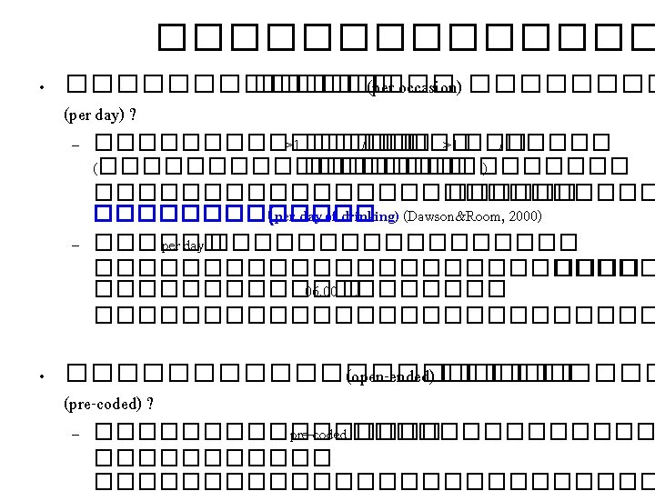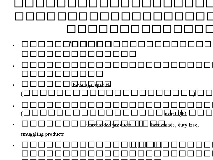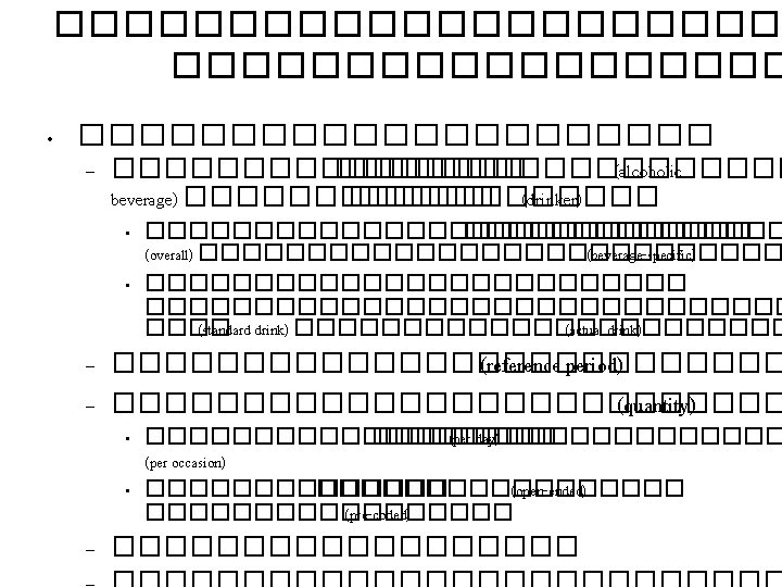 ����������� Characteristics Alcohol consumption Socio-demographics - Volume of consumption Alcohol-related characteristics - Risky (binge) drinking Other factors influence consequences -Pattern of drinking (Drinking behavior) -History of drinking (& drinking in the past) Consequences Health and Social effects (from other vs. their selves) - Accident (drink-drive) - Violence - Crime - Dependence/Liver cancer - Diseases Productivity lost Condition of drinking Other behaviors and attitudes Frequency (occasion) Location of drinking Type of beverage Participants Unrecorded products Effectiveness of alcohol policy Opinion on alcohol policy - Absenteeism - Unemployment - Death? Expenditures due to alcohol consumption - Consumption - Healthcare (OOP)