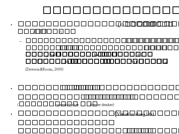 ��������� • Prevalence of alcohol-impaired driving: Results from a national selfreported survey of health behaviors (Liu et al, JAMA 1997) – BRFSS 1993 (alcohol-impaired driving, and its episodes) • Binge drinking among US adults (Naimi et al, JAMA 2003) – BRFSS 1993 -2001 • Age of drinking onset and unintentional injury involvement after drinking (Hingson et al, JAMA 2000) – National Longitudinal Alcohol Epidemiology Survey • Average volume of consumption, pattern of drinking, and all-cause mortality: Results from the US National Alcohol Survey (Rehm et al, Am J Epidemiol 2001) – Follow-up the 1984 National Alcohol Survey participants in 1995