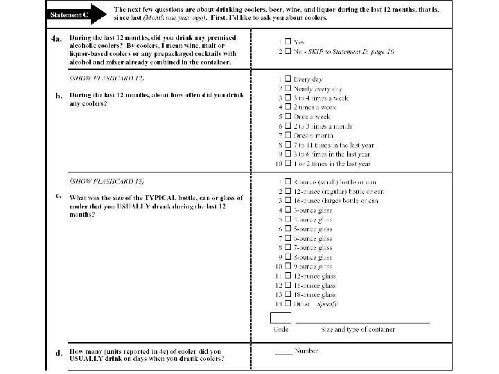 Survey questionnaire of NIAAA • • Alcohol consumption (p 9 -18) Alcohol experience (p 19 -26) Treatment utilization (p 27 -28) Family history (p 29 -32)