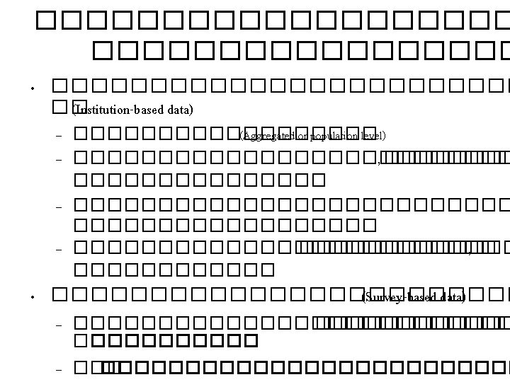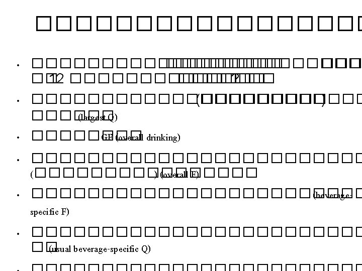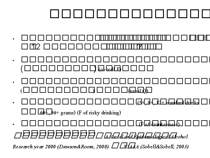 ��������� • Consumption of alcoholic beverage and subjective health in Spain (Guallar-Castilon et al, J Epidemiol Community Health 2001) – The 1993 Spanish National Health Survey • Alcohol consumption and expenditure for underage drinking and adult excessive drinking (Foster et al, JAMA 2003) – 3 surveys: NHSDA, YRBS, and BRFSS (with national data on consumption and consumer expenditures for alcohol) – Results: 50. 1% of consumption and 48. 9% of expenditure were arisen from underage drinking and adult excessive drinking