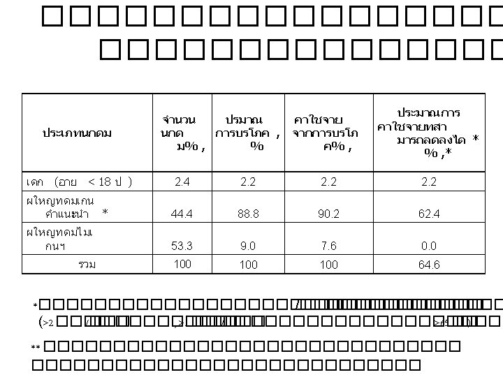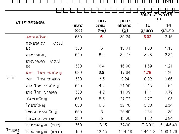 ��������� Patterns, expenditures and health outcome of alcohol consumption in Thai people Socio-demographic factors -Sex -Age -Education -Marital status -Household income -Employment status Type of alcoholic beverage Amount of alcohol consumption (Number of drinks) Price Pattern of alcohol consumption (quantity-frequency approach) Geographic factors -Region Health behavior -Smoking Chronic diseases -Social drinking -Binge drinking -Regular drinking -Chronic heavy drinking Expenditure of alcohol consumption (Baht) Health outcome -Injury-related hospital visits