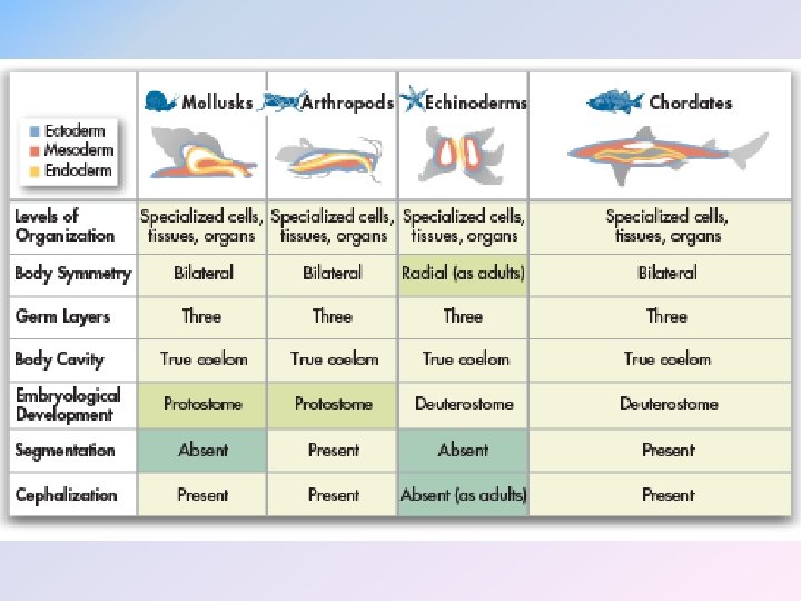 Features of Body Plans • Features of animal body plans include: • • levels of organization body symmetry differentiation of germ layers formation of body cavities patterns of embryological development segmentation cephalization limb formation