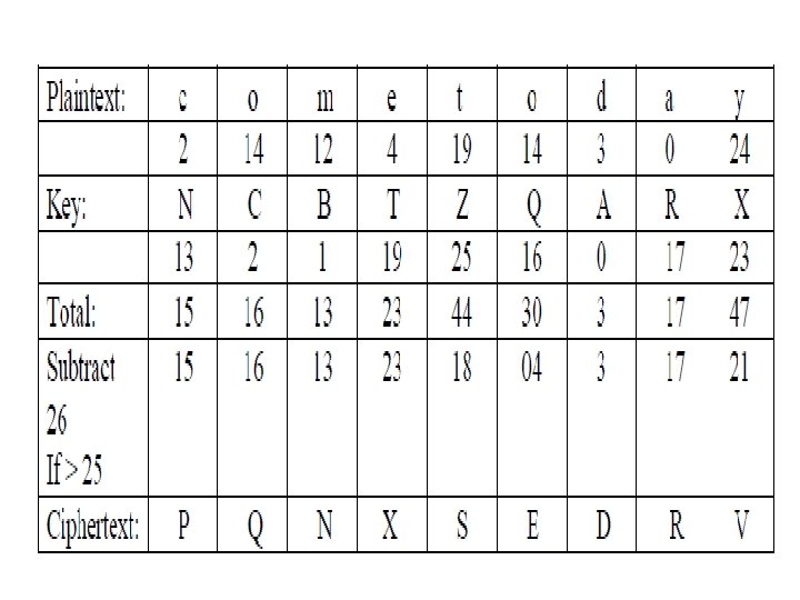 • An example of polyalphabetic substitution is the Vigenere Cipher. • 26 Caesar ciphers are used, with shifts of 0 through 25. • Each cipher is denoted by a key letter (from a to z). • For example : Let the message be THE BOY HAS THE BAG and the key be VIG