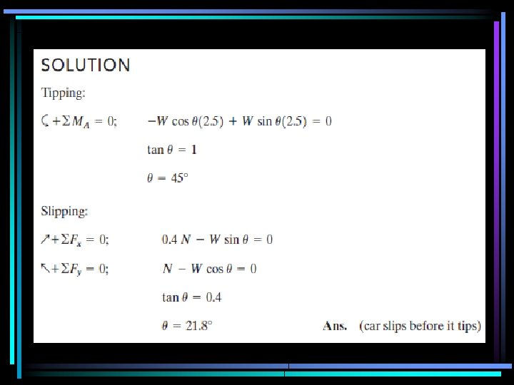 Example: The car has a mass of 1. 6 Mg and center of mass at G. If the coefficient of static friction between the shoulder of the road and the tires is s = 0. 4, determine the greatest slope the shoulder can have without causing the car to slip or tip over if the car travels along the shoulder at constant velocity.