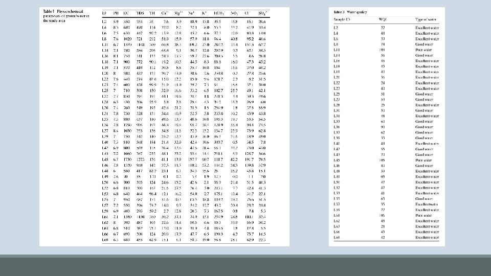 Conclusions • For Drinking: 59% of samples represent excellent water, 33. 3% represent good water, and 7. 7% represent poor water • Suitability is determined using the WQI (water quality index) technique • WQI is calculated by weighting certain variables based on their importance to drinking water and producing a rating that considers the influences on water quality in the area • For Irrigation: 69. 2% suitable, 20. 8% unsuitable • Suitability is determined using sodium adsorption ratio (SAR) and sodium percentage • High SAR and Na% can increase compaction and decrease porosity in soils, undesirable for irrigation