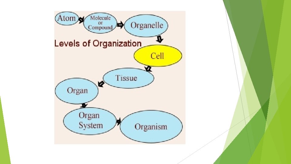 Levels of Organization Put these in order from smallest to largest: Organelle Atom Tissue Cell Organ system Molecule Organism