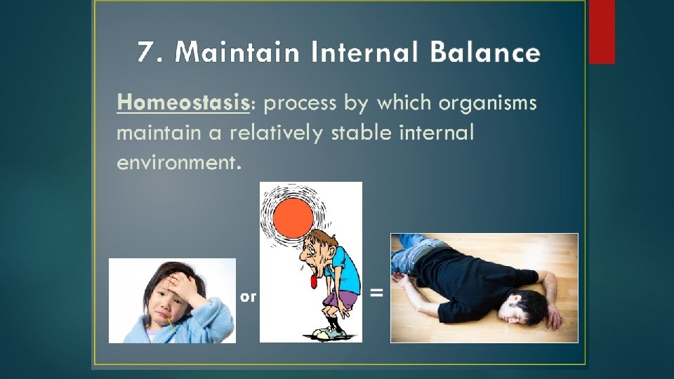 For example Your body tries to maintain homeostasis when you are sick with a fever. You may sweat in order to cool down your internal body temperature.