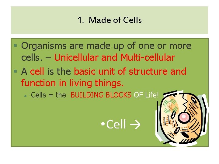 1. Made of Cells § Organisms are made up of one or more cells. – Unicellular and Multi-cellular § A cell is the basic unit of structure and function in living things. l Cells = the BUILDING BLOCKS OF Life! • Cell →