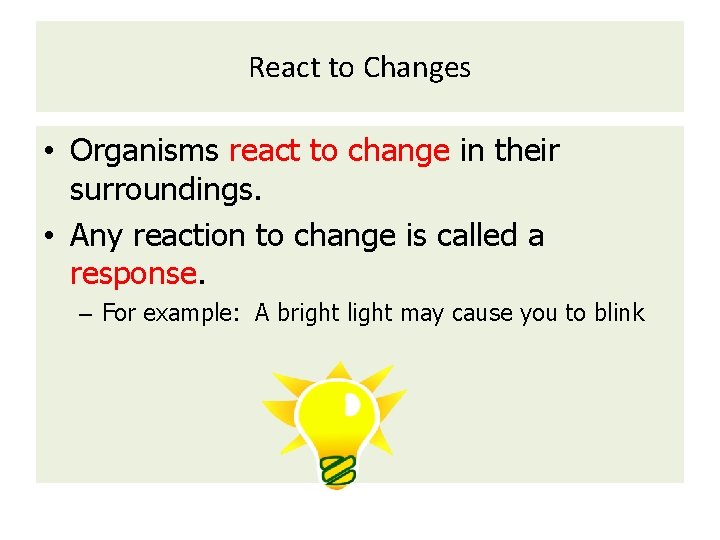 React to Changes • Organisms react to change in their surroundings. • Any reaction to change is called a response. – For example: A bright light may cause you to blink