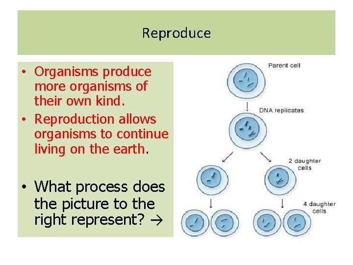 Reproduce • Organisms produce more organisms of their own kind. • Reproduction allows organisms to continue living on the earth. • What process does the picture to the right represent? →
