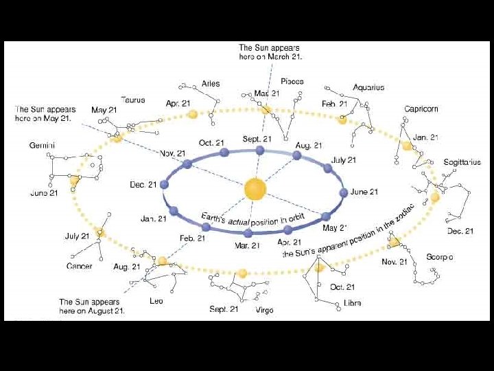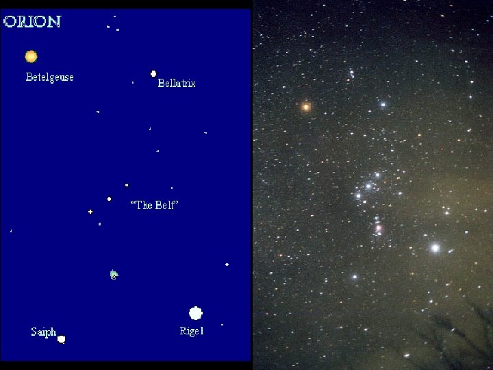 • The positions of the constellations as viewed from Earth changes from season to season • This is caused by the change in Earth’s position in its orbit around the sun – Example: Orion the Hunter is a winter constellation