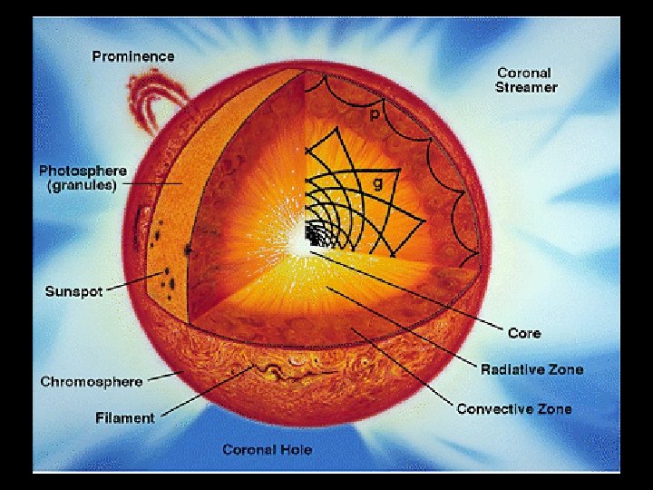 Properties of the Sun • average size yellow star • fairly cool compared to other stars • diameter is approx. 110 times larger than Earth’s, with a volume that hold more than 1, 000 Earths. • Light traveling from the sun takes approx. 8 minutes 20 seconds to reach Earth! • surface temperature is approx. 5, 500 C and its interior temperature is