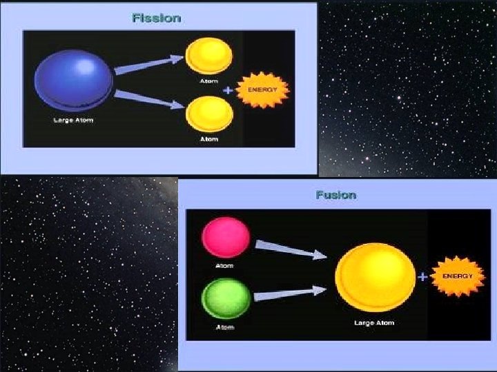 • friction increases and temperature increase until the center becomes so hot that nuclear fusion takes place • hydrogen atoms are forced together to form helium atoms, and energy is released • In a nuclear reactor like Indian Point, nuclear fission takes place – This is when radioactive atoms are split apart to release energy