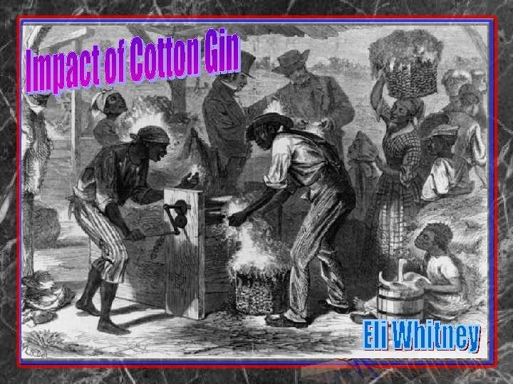 King Cotton • short-staple cotton introduced • Demand grew in GB in 20 s and 30 s and New England in the 40 s and 50 s • SC, GA, AL, Miss, LA, TX, AK • By Civil War = 2/3 of US exports