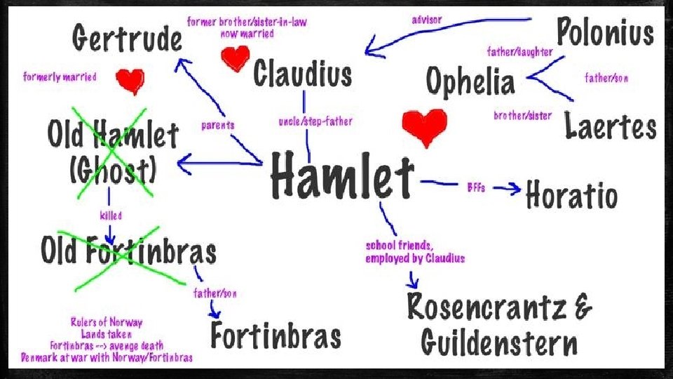 Ophelia: • Polonius's daughter, Laertes's sister, and Hamlet's love. • As a woman, Ophelia must obey the men around her and is forced by her father first to stop speaking to Hamlet and then to help spy on him. • Ophelia's loyalty to her father and resulting estrangement from Hamlet ultimately causes her to lose her mind. • Though Laertes and Fortinbras are the characters usually seen as Hamlet's "doubles, " Ophelia functions as a kind of female double of Hamlet— • mirroring Hamlet's half-madness with her own full-blown insanity, and takes his obsession with suicide a step further and actually commits it.