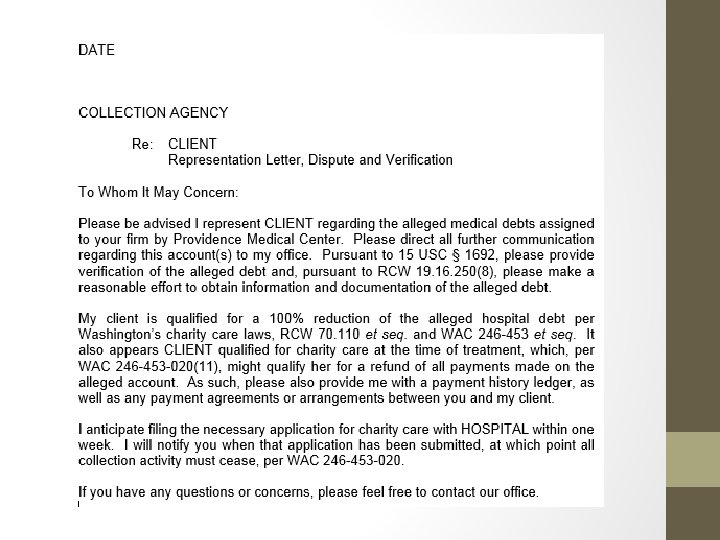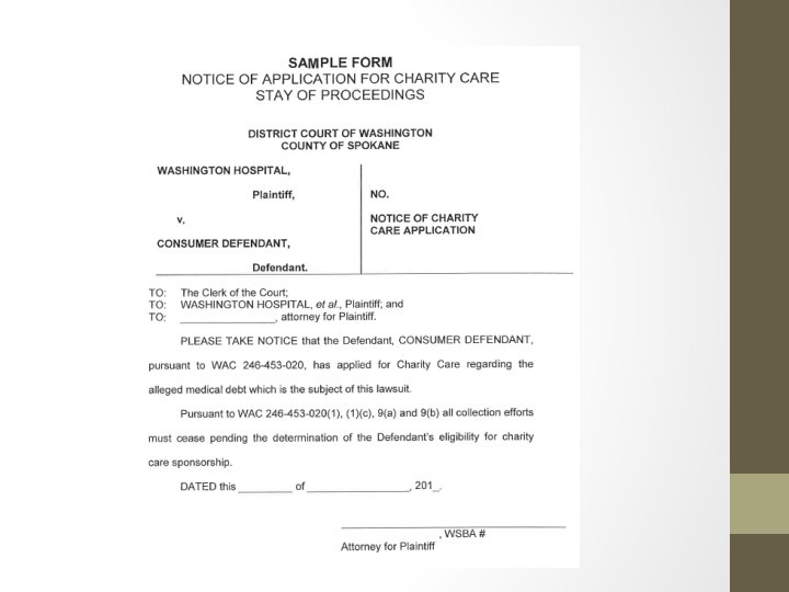 Applying for Charity Care Suspending Lawsuit to Allow Patient to Apply for Charity Care • Raise Charity Care as an affirmative defense • Sample Pro Se Answer Form with Charity Care Affirmative Defense in “How do I Answer a Lawsuit for Debt Collection? ” publication: http: //www. washingtonlawhelp. org • Sample Letters to Debt Collection Agencies or Opposing Attorneys in “Can I Get Charity Care Benefits To Pay for My Hospital Bill? ” publication: http: //www. washingtonlawhelp. org