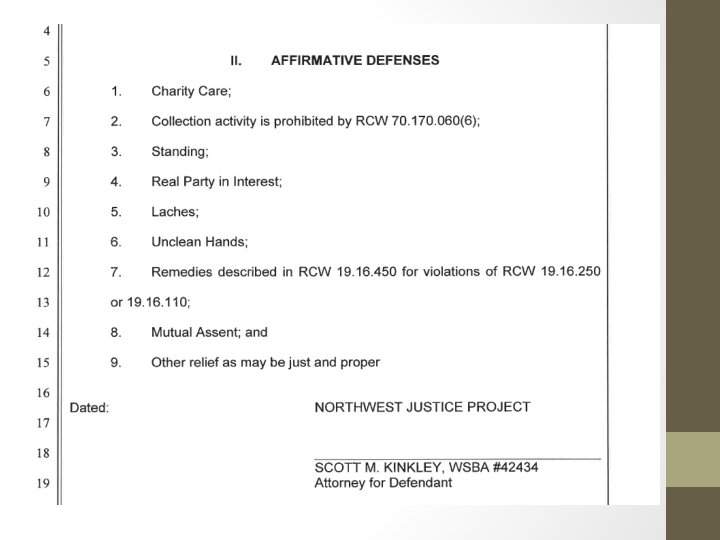 Affirmative DUTY to Screen Before Collection Attempts • “Initial determination of sponsorship status shall precede collection efforts directed to the patient. ” RCW 70. 170. 060(6) • “Persons who may be eligible for charity care shall be notified by the hospital” and “all persons with family income below one hundred percent of the federal poverty standard shall be deemed charity care patients for the full amount of hospital charges. ” RCW 70. 170. 060(5)