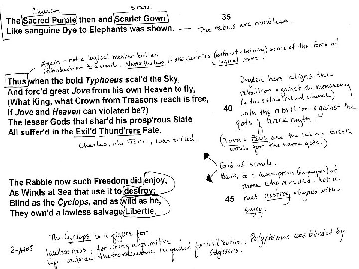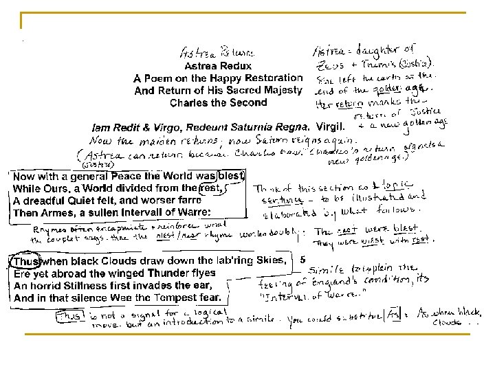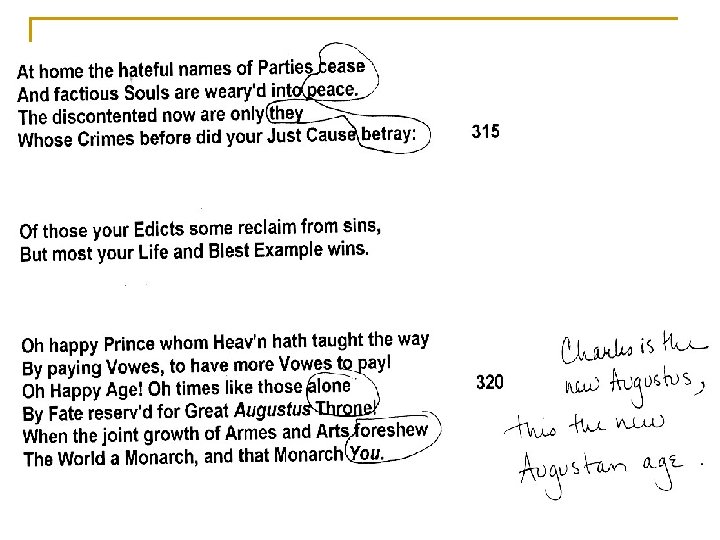 A note about what the poem says: n n The poem celebrates the restoration of the monarchy and supports q the traditional hierarchical social order and q inheritance as the fundamental principle that ensures social order. Although the poem does not vilify particular opposition leaders, it represents the opposition as “designing leaders” manipulating an irrational crowd, the Rabble. The most radical ideas of the opposition-political egalitarianism and religious toleration--do not come into view as serious political principles. On the other hand, although the poem’s case against lawlessness is a case against the opposition, it implies a case against arbitrary power in any hands. On the nature of the King’s power, the poem carefully balances between a claim of divine approval and a denial that the king is above the law.