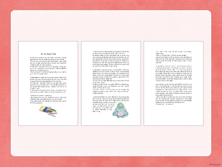 “Do you think that’s nice enough for your grandad? ” she smirked as she got back on her feet but Charlie didn’t smile back. He blinked, rubbed his eyes and stared with his mouth wide open. Amy was completely confused and was about to give him a friendly punch in the arm when she heard a tiny, gentle miow from behind her. She span around to see that her drawing of a cat had come to life! The cat brushed softly between Amy’s legs as she stood there amazed. Charlie picked up the magical pack of chalk and looked mischievously at Amy. Charlie began drawing furiously all over the floor while Amy stroked the cat and waited for him to finish. Charlie proudly looked down at his chalk picture after a few minutes. He had drawn a pink and purple spotted monster with three green eyes, big claws on its hands and a yellow, wiggly mouth. Amy chuckled and Charlie looked hurt. “He will scare all of the little kids when he comes alive. He likes to eat small children!”