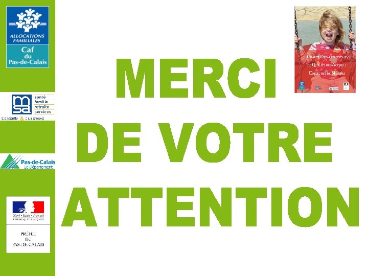 La Caisse d’Allocations Familiales du Pas -de - Calais : Service de l’Action Sociale La Direction Départementale de la Cohésion Sociale du Pas- de-Calais : Service Expertise Contrôle Évaluation La Mutualité Sociale Agricole du Nord Pasde-Calais : Service Action Sanitaire et Sociale Le Conseil Général du Pas-de-Calais: Service de la Protection Maternelle Infantile Une nouvelle équipe Une volonté conjointe Accompagner les organisateurs d’A. C. M. et leurs équipes éducatives à développer la qualité des projets éducatifs et des pratiques pédagogiques