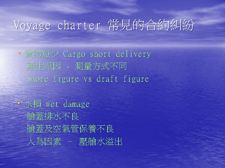 Charter Party Voyage Charter Party Time Charter Party Slides: 20 Download presentation 錯綜複雜的合約關係 • 常見的運送合約 Charter Party • Voyage Charter Party 論程合約 • Time Charter Party 論時合約 船舶指數 • Baltic Exchange Capesize Index Panamax Index Supramax Index Handysize Index 船舶租金參考數據 • BCI Average of the T/C routes • BPI Average of the T/C routes • BSI Average of the T/C routes • BHSI Average of the T/C routes 論程租傭船中常見的文件 • Sailing Instruction 航次指示 • Stowage plan 裝載計畫 • Notice of Readiness 裝卸貨備便通知 • Statement of Fact 裝卸貨記錄 • Draft Survey Report 水呎檢驗報告 • Mate Receipt 貨品簽收單 • Bill of Lading(s) 提單 • 文件需經船長認證簽署