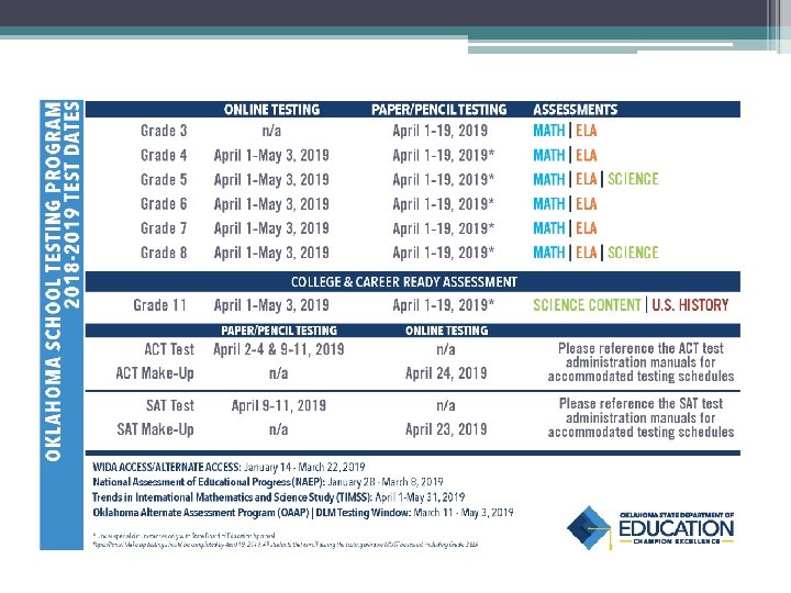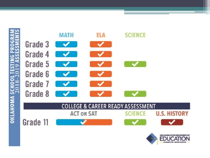 Oklahoma School Testing Program • Oklahoma School Testing Program (OSTP) • Grades 3 -8 • College- and Career-Readiness Assessments • Grade 11 • Oklahoma Alternate Assessment Program (OAAP) • Grades 3 -8 and Grade 11