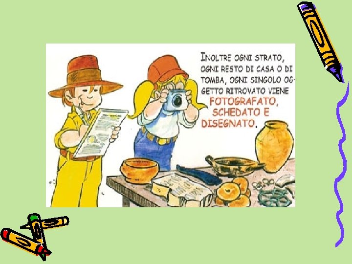 Per poter studiare gli strati archeologici, l’archeologo deve scavarli, e quindi distruggerli. Ma in questo modo prende nota con cura di tutte le notizie che la terra contiene. I resti delle attività umane: case, forni, buche…